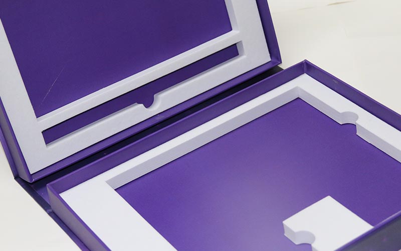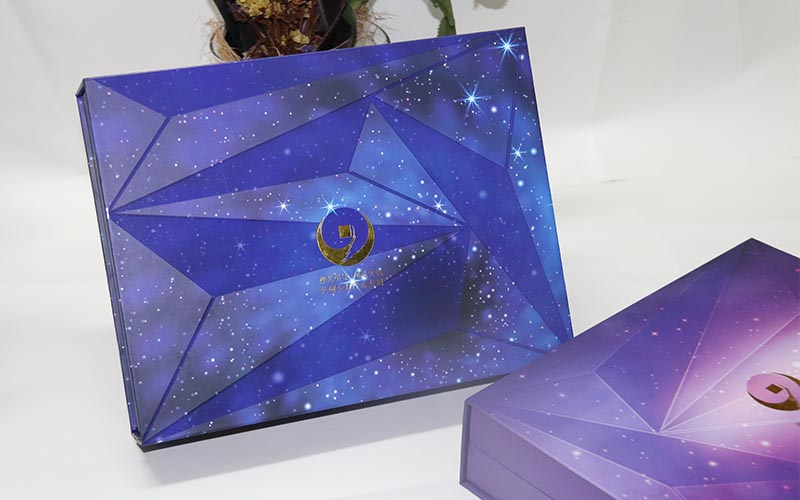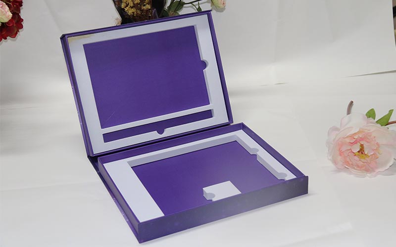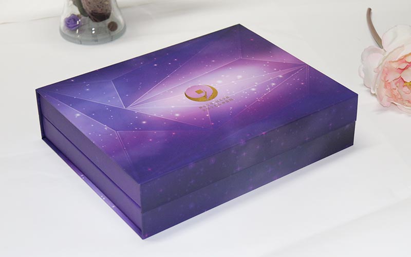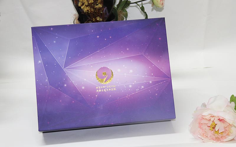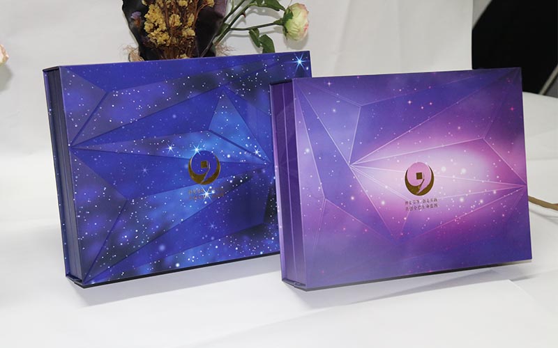 1.材質:盒子面紙採用157G銅版紙,表面彩色印刷 ,線條UV光油,LOGO文字燙金。裱1500G雙灰闆,盒子爲藍,紫兩個顔色,内托爲白色内盒裏面全部貼滿彩紙,盒型爲上下翻蓋盒磁鐵要有吸度。