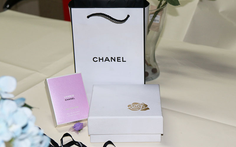 1.材質:品牌香水包裝盒定制,外盒材質採(cǎi)用180G白色特種紙,面紙燙(tàng)金色LOGO玫瑰花,(此款香水包裝盒高仿Chanel),盒内結構採用粉色香型拉斯草,盒型爲天地盒材質都一樣。組裝完系上彩帶蝴蝶結,香水包裝盒成型後裝入250G銅版紙做的手提袋内,手提袋單面啞膜,LOGO燙黑金激凸。