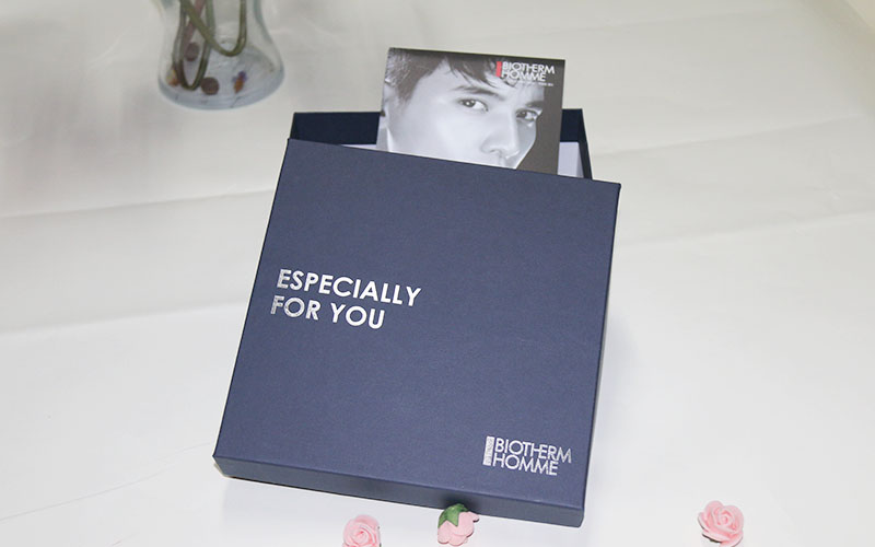 1.材質-面紙選用歐洲進口的磚石藍觸感特種紙,表面文字燙銀LOGO,下盒上盒一樣材質手工制作,裱1800G雙面白灰闆,盒型爲上下天地盒,盒内放拉斯草.整套化妝品包裝盒定制都是手工制作