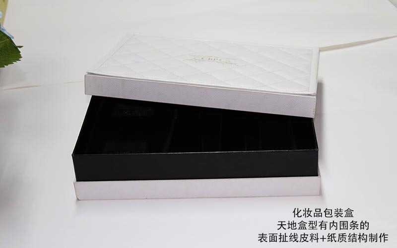 1. 材質:天盒表面扯線白色皮質上面文字LOGO燙金,皮質半成品做好粘在天盒上面,整款盒子都用白色帶(dài)紋路的特種紙手工裱1600G雙灰闆,底盒的内圍條用黑卡紙裱1500G雙灰闆,盒子内部裝EVA植絨(róng)内托,手工制作