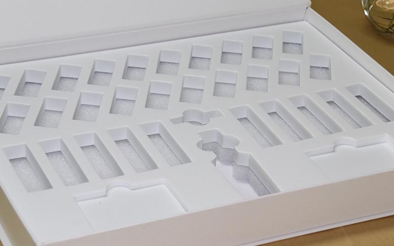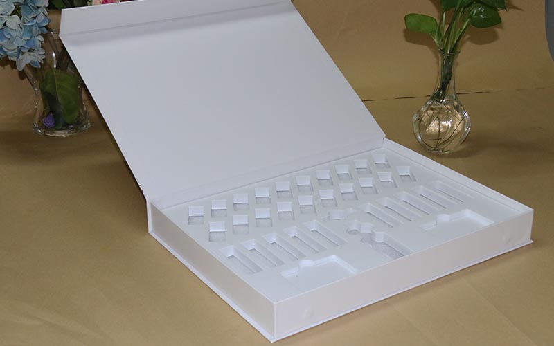 1.材質:盒子面紙用157G銅版紙單面彩色印刷,單面覆亞膜,裱1300G雙灰闆,内盒也是一樣的材質工藝,内托2層珍珠棉表面粘一層EVA,開模固定好産品,防止産品在裏面來回晃動,盒子比較大都是手工制作。