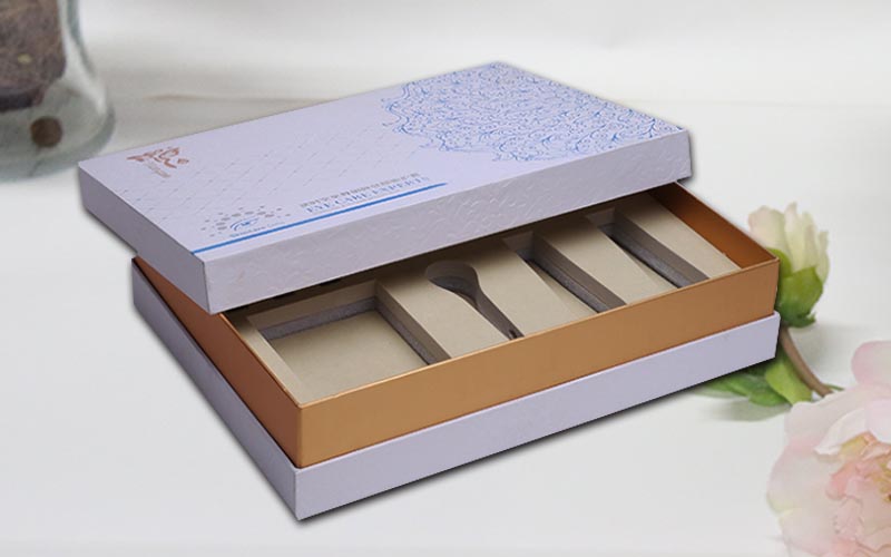 1.材質:盒子面紙用白色珠光紙,面紙單色印刷,LOGO燙藍金 ,表面壓紋,裱1500G雙灰闆,盒子上下盒材質工藝一樣 ,中間有金黃色圍條。盒子内托用EVA植絨,整款盒型都是按照客戶的産品尺寸定制,特種紙手工制作。