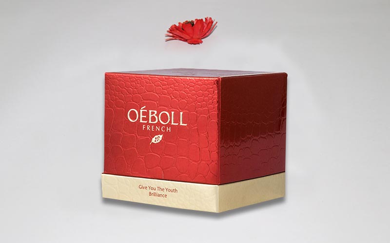 1.材質:單隻裝美白霜包裝盒,盒子面紙採用金卡紙,專紅色印刷,整個盒子都要做鳄魚紋路的壓紋工藝,單面覆光膜,裱1200G雙灰闆,盒子底部内托用白色EVA包金卡紙固定産品。盒子上下天地盒,手工制作成品。